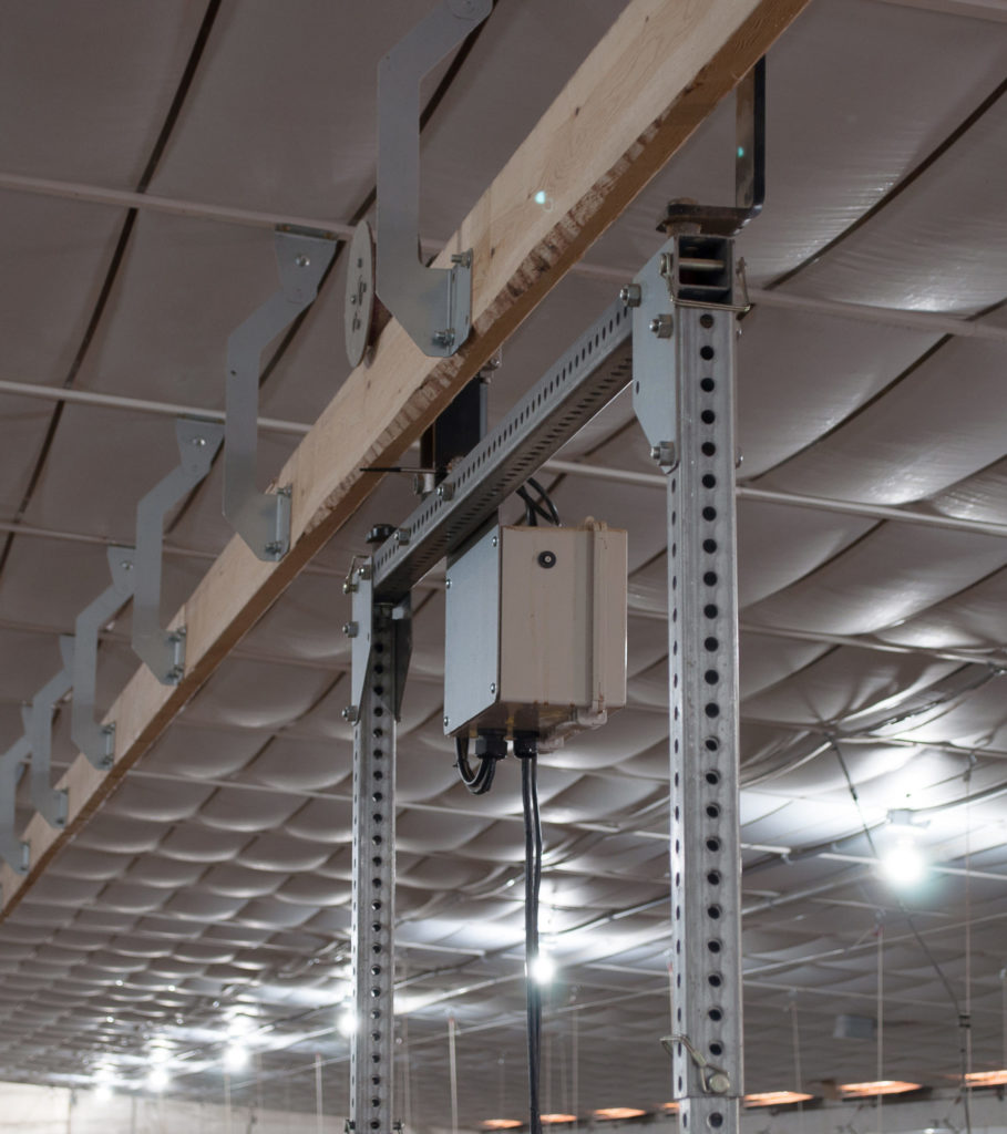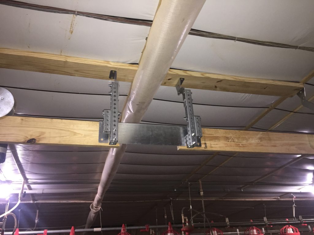 The truss brackets are secured to bottom of every truss with (2) GRK fasteners. A galvanized steel hanger bracket then attaches the 2 x 6 yellow pine (provided by the end user) rail to truss bracket. This simple and sturdy rail system drastically reduces the cost of installing a trolley system in your poultry house. And since the rail lumber is sourced locally, shipping the Chicken Reaper is very economical. For wider houses a metal rolled tube corner enables you to install a circular track.